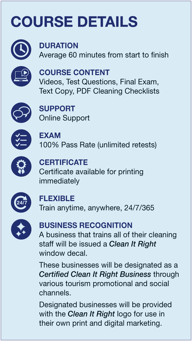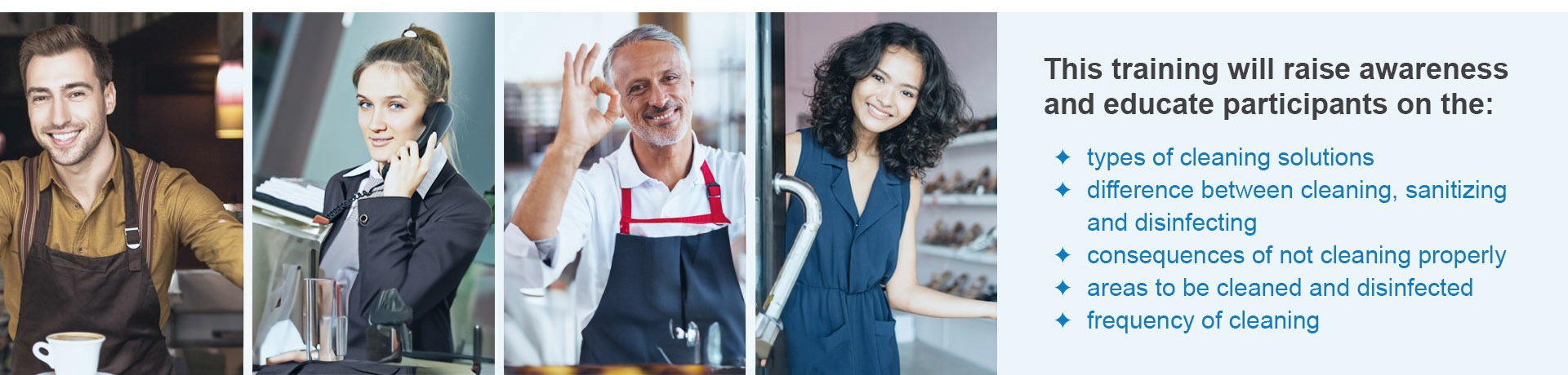 It is important to note that this session is NOT a program to teach participants HOW to be cleaners, or to replace internal policies and procedures. It is an awareness and education program that considers our current situation given COVID-19, but will also be a program that has long term benefits for business. The commitment to a clean and safe environment will give your business a competitive edge.